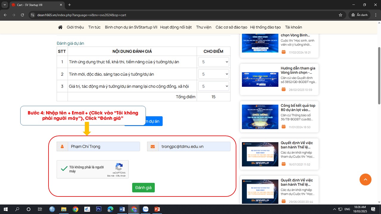 Bước 4: Nhập tên + Email + (Click vào “Tôi không phải người máy”), Click “Đánh giá”