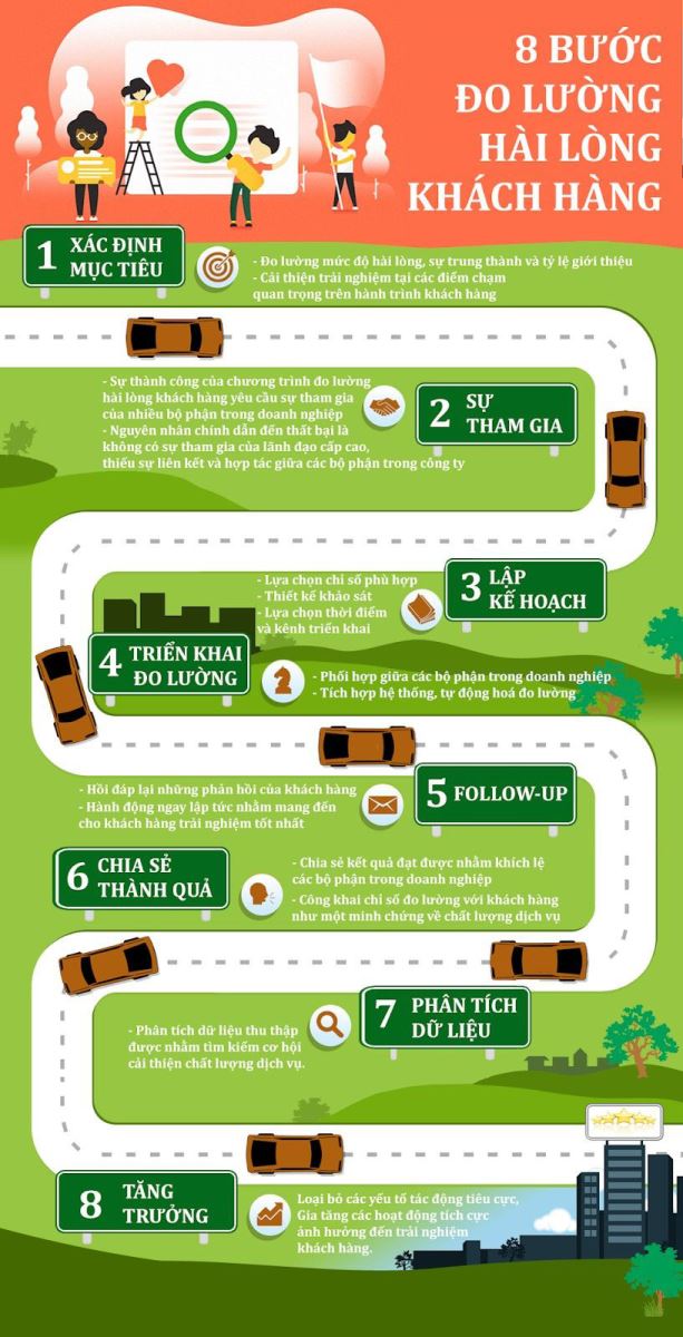 Infographic này minh họa 8 bước đo lường mức độ hài lòng của khách hàng một cách trực quan và dễ áp dụng cho doanh nghiệp. Từ việc xác định mục tiêu, huy động sự tham gia nội bộ, lập kế hoạch, triển khai đo lường đến phân tích dữ liệu và cải tiến liên tục, infographic giúp doanh nghiệp hiểu rõ tiếng nói khách hàng, nâng cao trải nghiệm tại các điểm chạm và thúc đẩy tăng trưởng bền vững dựa trên sự hài lòng và trung thành của khách hàng.