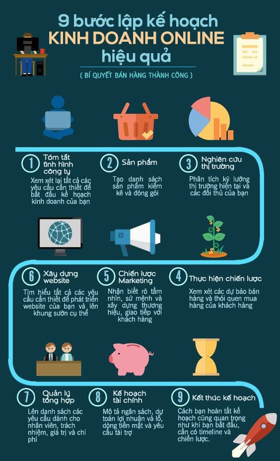 Infographic trình bày 9 bước lập kế hoạch kinh doanh online hiệu quả, từ việc đánh giá tình hình doanh nghiệp, lựa chọn sản phẩm, nghiên cứu thị trường đến xây dựng website, chiến lược marketing và quản lý tài chính. Nội dung được thiết kế trực quan, dễ hiểu, giúp người đọc nắm bắt nhanh lộ trình kinh doanh bài bản, tối ưu nguồn lực và gia tăng khả năng thành công trong môi trường kinh doanh số.