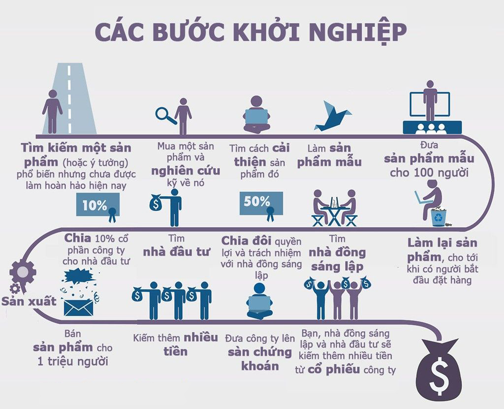 Khởi nghiệp là một hành trình từng bước, bắt đầu từ việc tìm kiếm ý tưởng hoặc sản phẩm tiềm năng, nghiên cứu – cải tiến để tạo ra giá trị khác biệt, sau đó thử nghiệm với thị trường thông qua sản phẩm mẫu. Khi ý tưởng được đón nhận, người khởi nghiệp tiếp tục hoàn thiện sản phẩm, tìm kiếm nhà đầu tư, xây dựng đội ngũ đồng sáng lập và mở rộng sản xuất – kinh doanh. Qua mỗi giai đoạn, doanh nghiệp dần tăng trưởng, tạo ra doanh thu, lợi nhuận và hướng tới những mục tiêu lớn hơn như mở rộng thị trường, gọi vốn quy mô lớn hay niêm yết trên sàn chứng khoán.