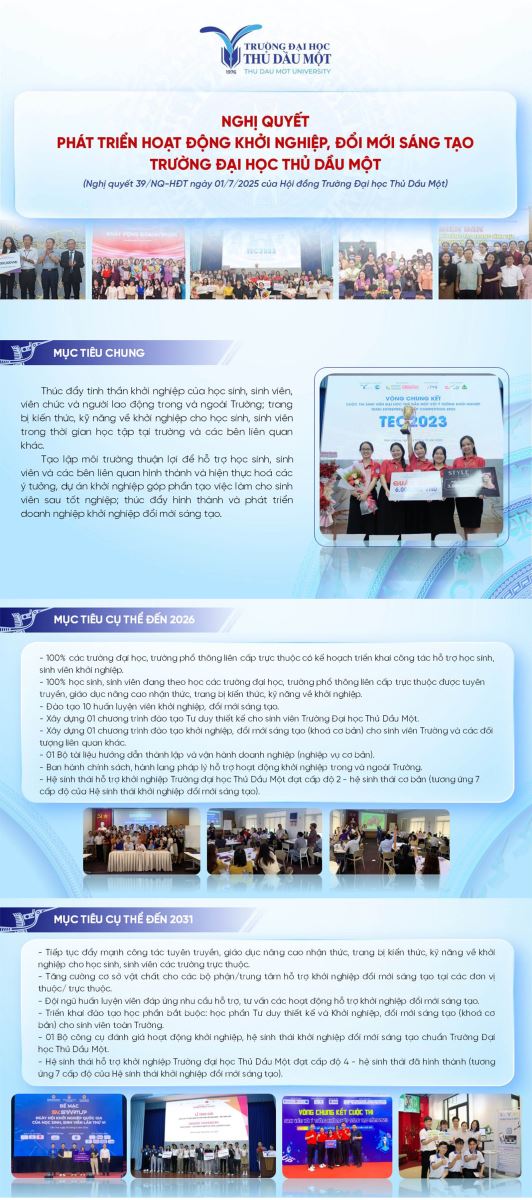 Infographic giới thiệu Nghị quyết 39 - phát triển hoạt động khởi nghiệp, đổi mới sáng tạo Trường Đại học Thủ Dầu Một được xây dựng nhằm khái quát tầm nhìn, mục tiêu và lộ trình triển khai công tác khởi nghiệp – đổi mới sáng tạo của Nhà trường trong giai đoạn mới. Nội dung infographic thể hiện rõ mục tiêu chung, các chỉ tiêu cụ thể đến năm 2026 và định hướng phát triển đến năm 2031, qua đó khẳng định cam kết của Trường trong việc tạo dựng môi trường học tập – thực hành thuận lợi, hỗ trợ học sinh, sinh viên hình thành tư duy sáng tạo, năng lực khởi nghiệp và từng bước phát triển hệ sinh thái khởi nghiệp đổi mới sáng tạo bền vững.