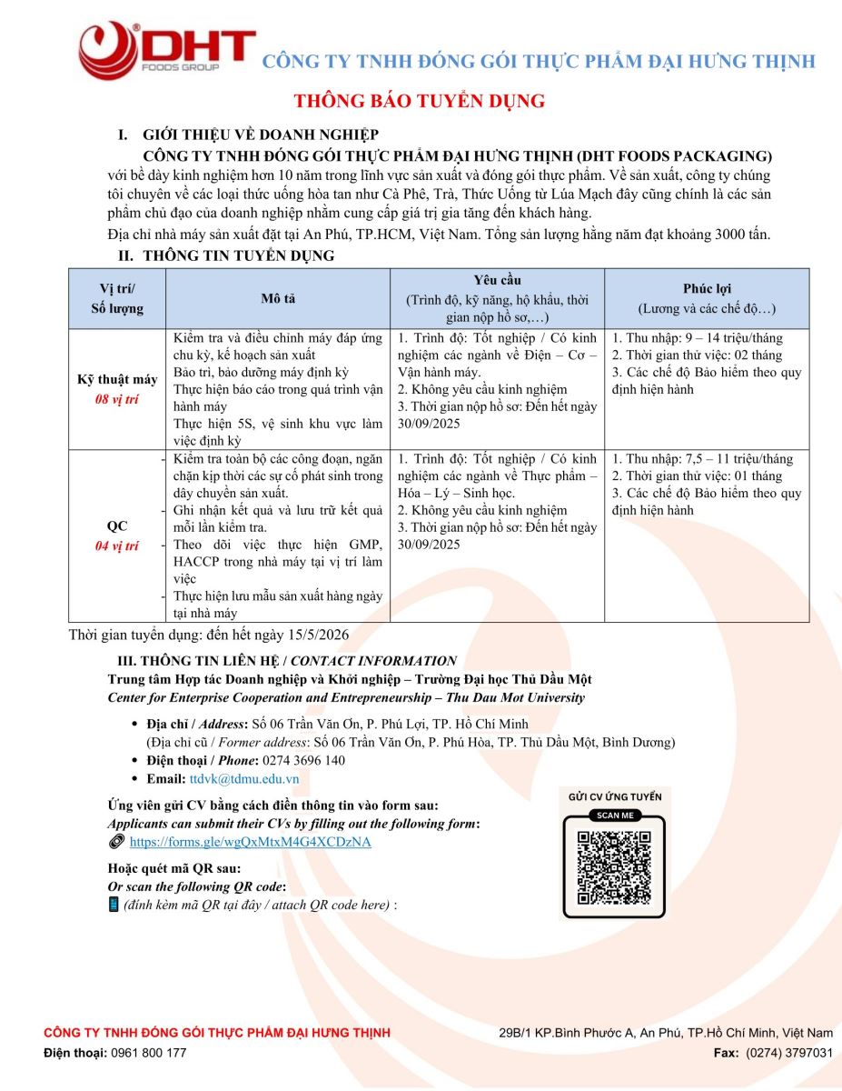 QC Lab / Trợ lý R&D / Nhân viên xuất nhập khẩu / Nhân viên thu mua